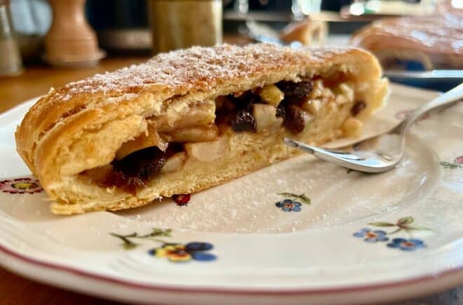 A co by to bylo mít domácí jablíčka, a přitom z těch méně „podařených“, trochu krabatých nebo naďobnutých od vos neupéct štrůdl. Pár receptů na záviny s jablky jsem si sem sice už ukládal (odkazy připojím na závěr), ale ono těch všemožných a hodně dobrých podob štrůdlového těsta je skutečně požehnaně! Ač je ten dnešní z kynutého těsta, jeho příprava moc času nezabere. Těsto vykyne docela rychle, velice příjemně se s ním při vyvalování pracuje a hlavně: I tenhle štrůdl u nás doma pokaždé velice chutná 🙂