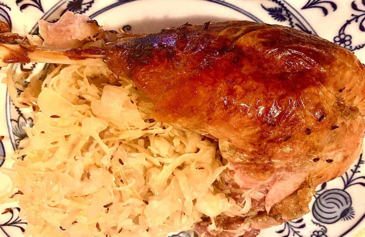 Porce husy podávám s bramborovým knedlíkem a podušeným kysaným zelím, přelévám trochou výpeku se sádlem.
