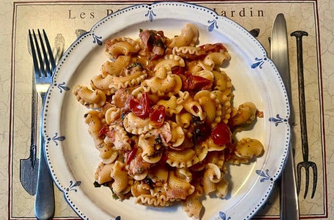 Těstoviny s rajčaty, slaninou, sýrem a medvědím česnekem