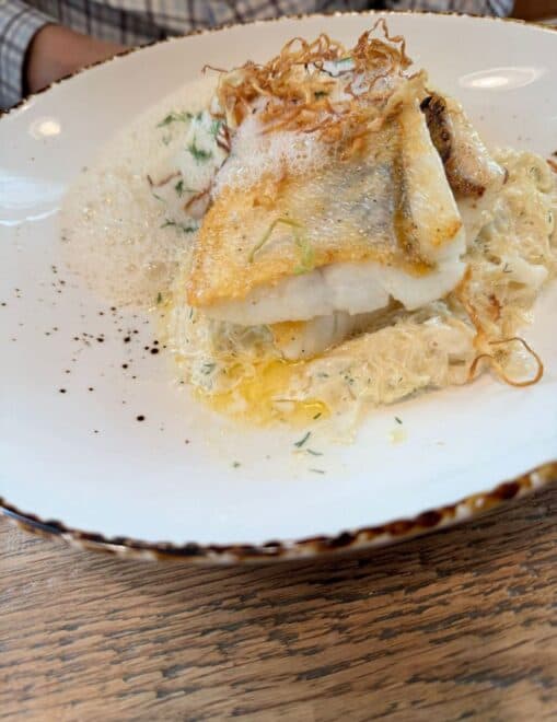 Co mě ovšem při návštěvě Matěje dostalo asi úplně nejvíc, byl na másle pečený candát se šťouchanými bramborami se slaninou a se šukrutem z kysaného zelí (u nás nepříliš známý choucroute je, pokud vím, původem z Alsaska, kde kysané zelí připravují podle speciálního receptu). Hodně nezvyklé spojení chutí opečené ryby a kysaného zelí je prostě jedním slovem naprosto dokonalé 🙂