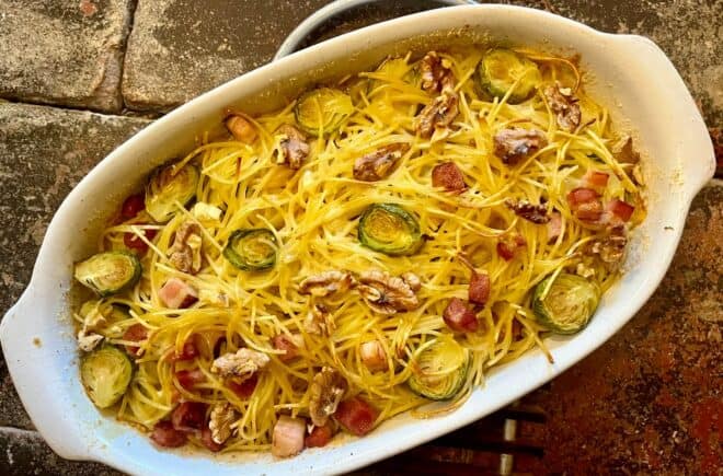Výsledek? Kapusta, ořechy a česnek společně s těstovinami a slaninou byly ve skvěle vyladěném akordu, který špetka kůry z citronu nečekaně dobře podtrhla, nahoře lehce křupavá krustička, uvnitř díky syrečkům lahodná krémovost a samozřejmě i vůně. Velká spokojenost u stolu i na mojí straně 🙂