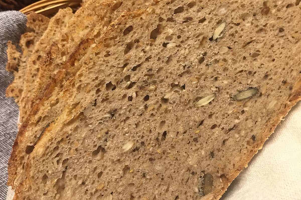 Tenhle chleba mám moc rád. Díky špaldě má příjemnou, lehce oříškovou chuť, semínka v chlebu nejen dobře vypadají, ale i krásně křupají. Pečivo ze špaldové mouky navíc dobře kyne, což je u tohoto tužšího těsta s větším množstvím přidaných semínek důležité. Právě kvůli semínkům je tento chleba výborný pro zažívání, díky špaldě je i lehčeji stravitelný a obsahuje hodně minerálních látek. I tento kváskový chléb vydrží dlouho vláčný.